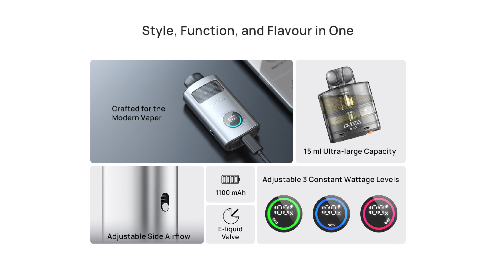 Avata est doté d’une batterie intégrée de 1100mAh qui assure des performances durables tout au long de la journée. Grâce à la prise en charge de la charge rapide 1A, vous pouvez recharger rapidement votre appareil et reprendre la vape sans attendre longtemps.