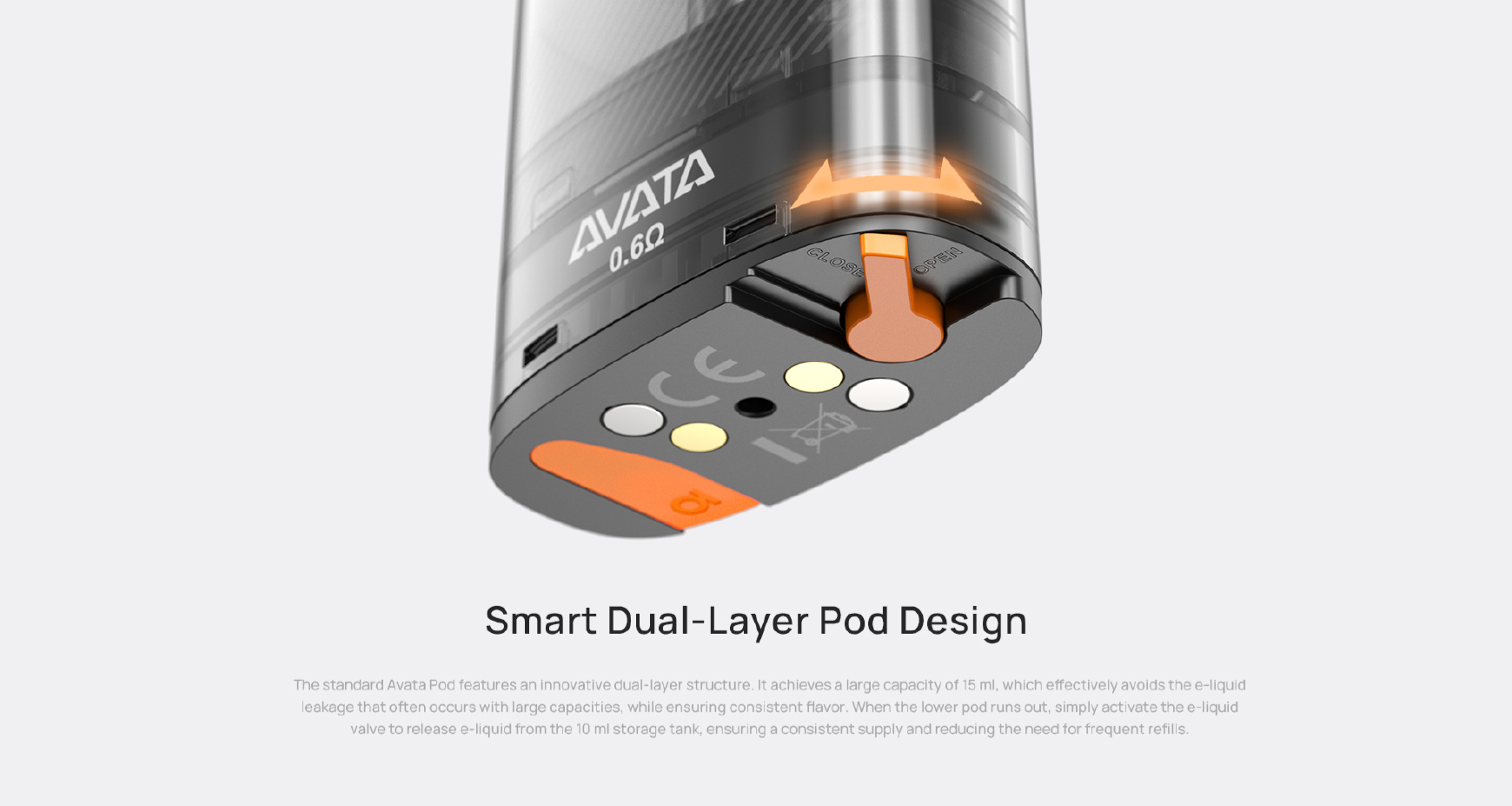 La cartouche standard d’Avata adopte une structure innovante à double couche. Elle offre une grande capacité de 15ml tout en évitant efficacement les fuites de e-liquide fréquentes avec les réservoirs de grand volume, tout en garantissant une saveur constante. Une fois la partie inférieure vidée, il suffit d’activer la valve pour libérer le e-liquide du réservoir de stockage de 10 ml, assurant ainsi un approvisionnement continu et réduisant la fréquence des remplissages.