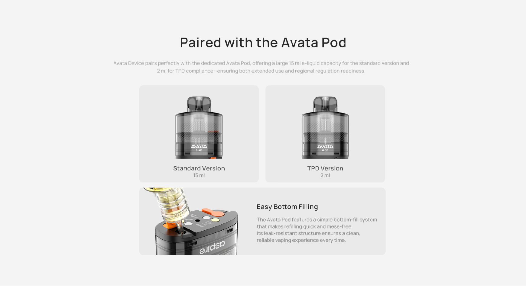 Le podAvata se combine parfaitement avec la cartouche dédiée Avata, offrant une grande capacité de 15 ml pour la version standard et 2 ml pour la conformité TPD — garantissant à la fois une utilisation prolongée et le respect des réglementations.