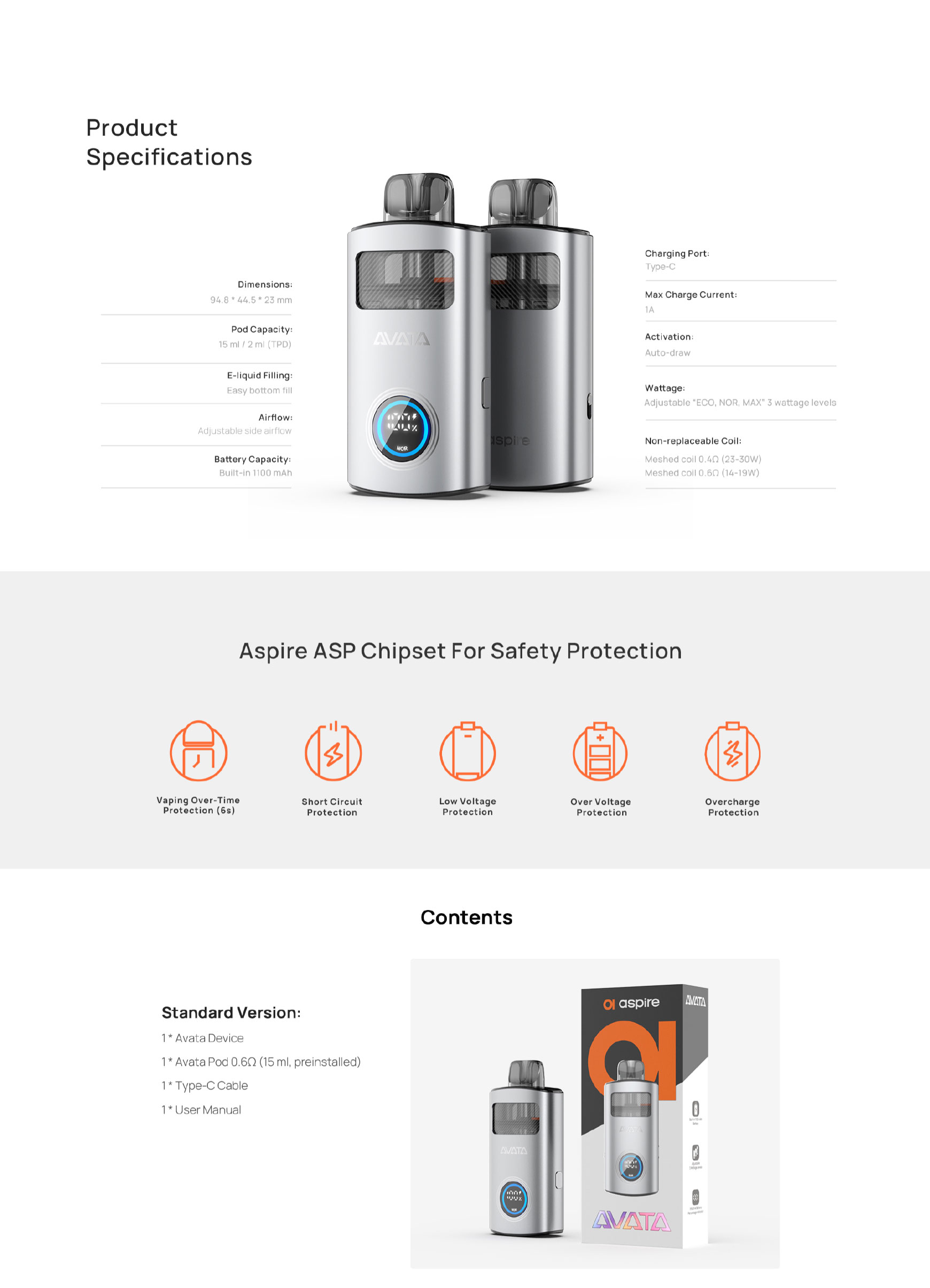 Le kit Avata d’Aspire est un pod compact (94,8 x 44 x 23 mm) avec une batterie intégrée de 1100 mAh et un port USB-C. Il offre trois niveaux de puissance (ECO, NOR, MAX) et une inhalation automatique. Son réservoir de 15ml se remplit par le bas. Équipé de résistances mesh 0.4Ω ou 0.6Ω non remplaçables et d’un flux d’air latéral réglable, il assure une vape simple, efficace et savoureuse.