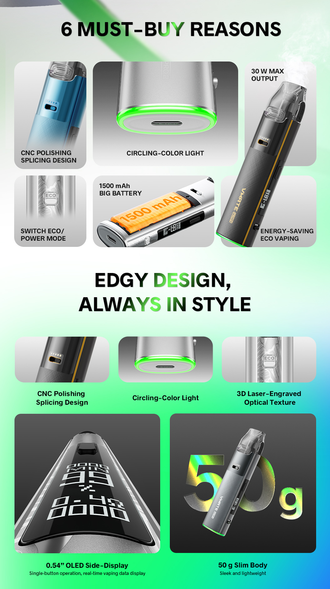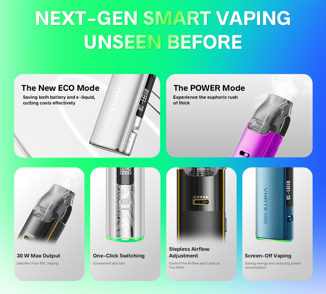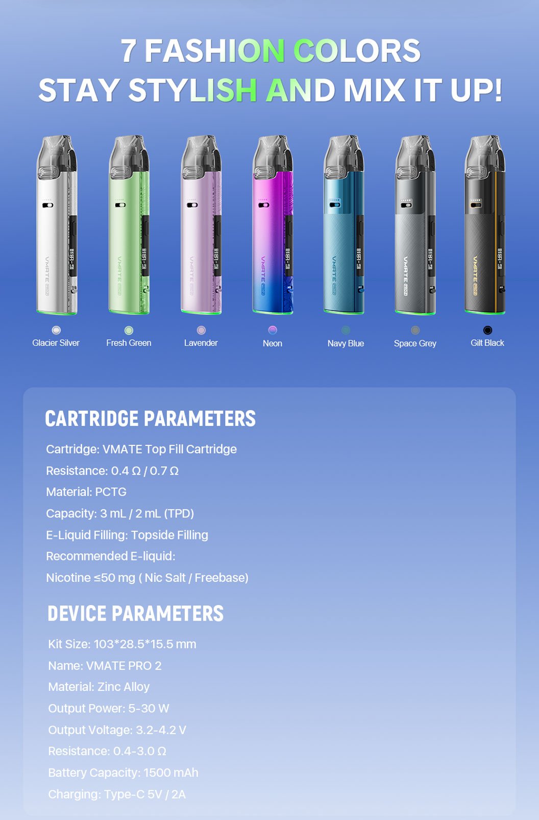 Le Vmate Pro 2 de Voopoo est une e-cigarette compacte et performante, idéale pour un vapotage quotidien pratique. Doté d’une batterie intégrée de 1500 mAh, il assure une bonne autonomie et propose deux modes d’utilisation : ECO pour économiser l’énergie et POWER pour une vape plus intense. Sa puissance maximale de 30 W permet une production de vapeur adaptée aux besoins de chacun. Design moderne et élégant, il est sublimé par une lumière circulaire multicolore qui apporte une touche unique et stylée à chaque bouffée.